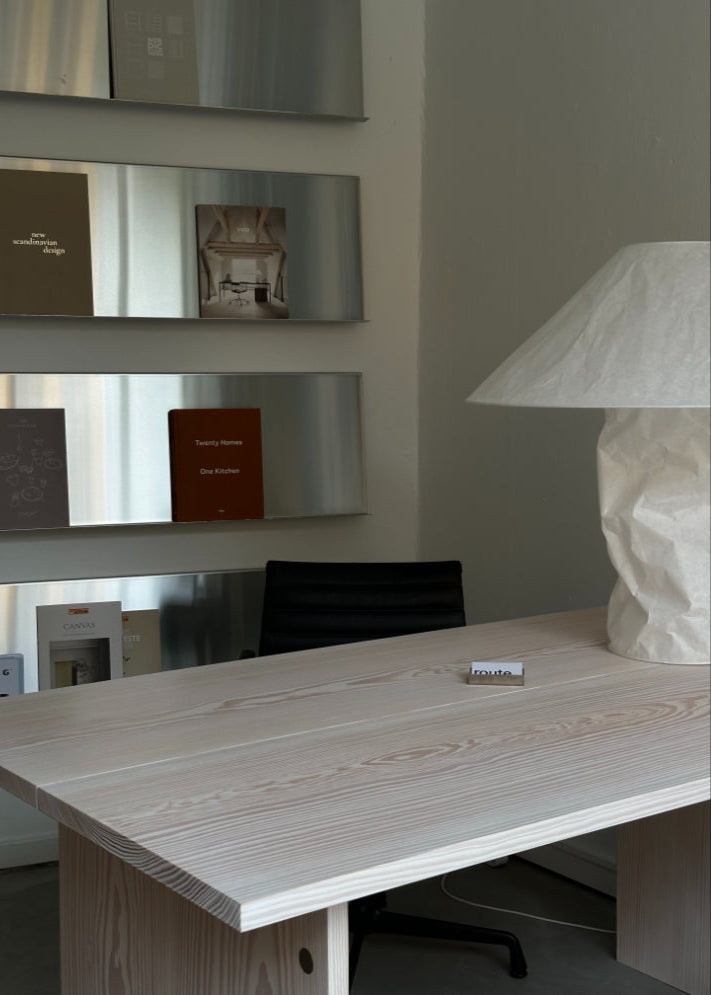 Her kan du udforske et udvalg af vores egne designs og skræddersyede løsninger, der er udviklet af route_ og skabt i tæt samarbejde med vores dygtige samarbejdspartnere. Hvert design er resultatet af en omhyggelig proces, hvor form, funktion og materialer forenes i unikke løsninger, der er tilpasset det enkelte rum og kundens ønsker. Vi lægger vægt på høj kvalitet, æstetik og holdbarhed, og skaber møbler og elementer, der skiller sig ud.