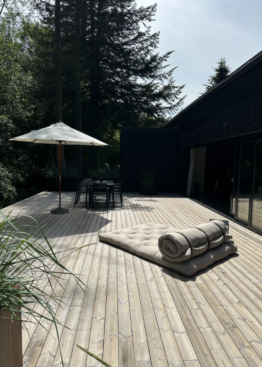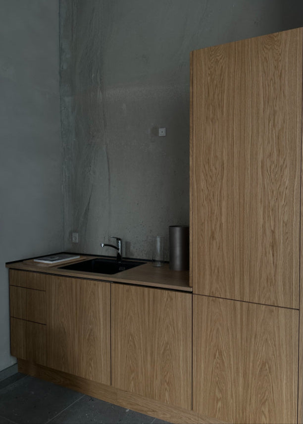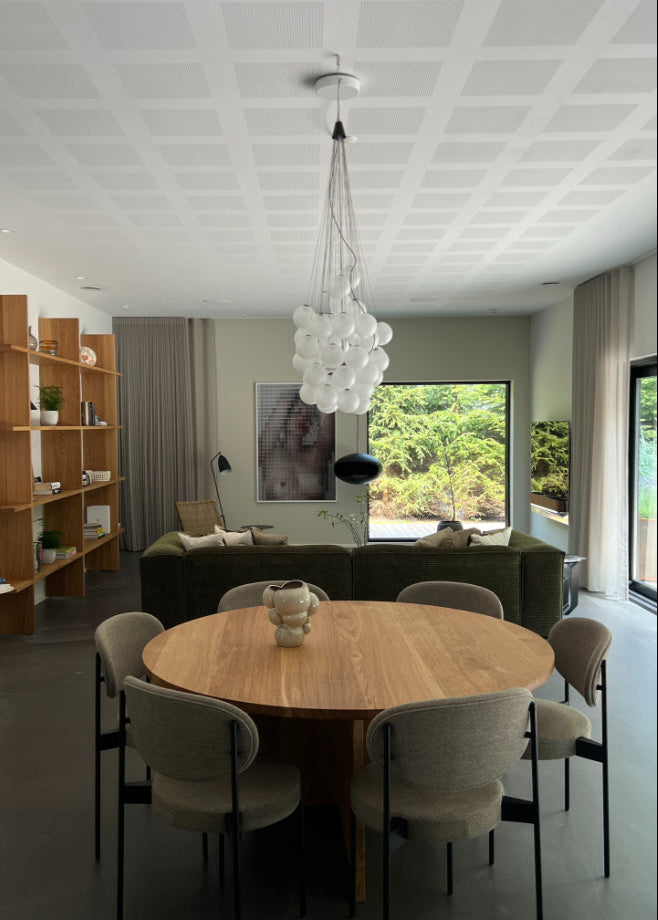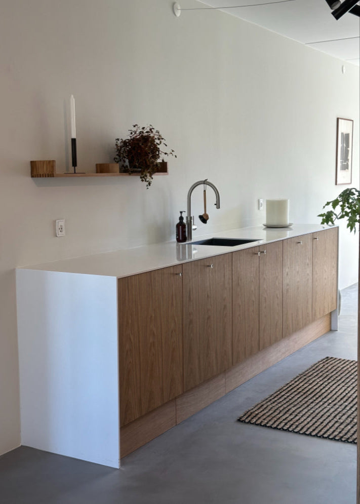 En fuld indretning af privatbolig med udgangspunkt i custommade løsninger, herunder en snedkerlavet reol og spisebord, skabt i tæt dialog med kunden. Sammenhængen mellem inde og ude skabes gennem gennemgående materialer og farvevalg.
