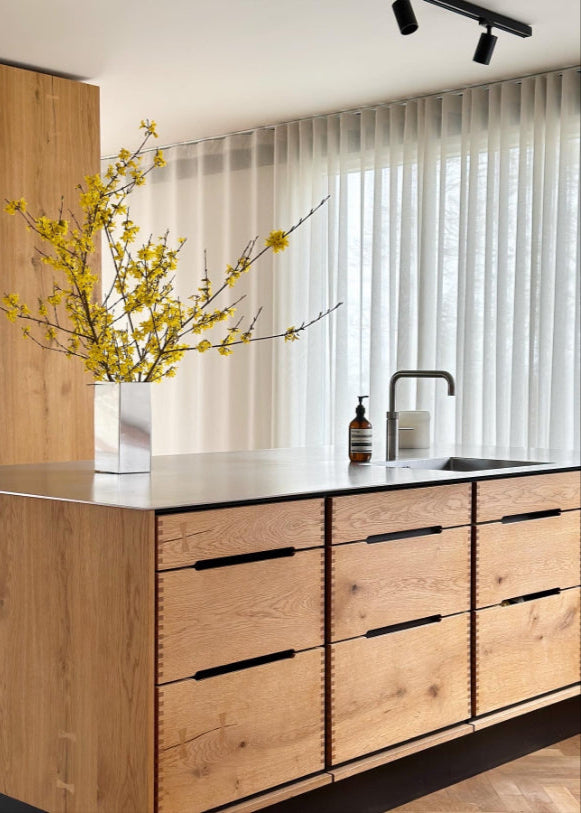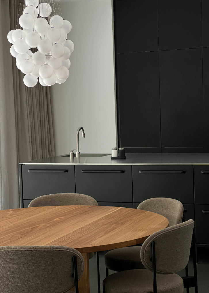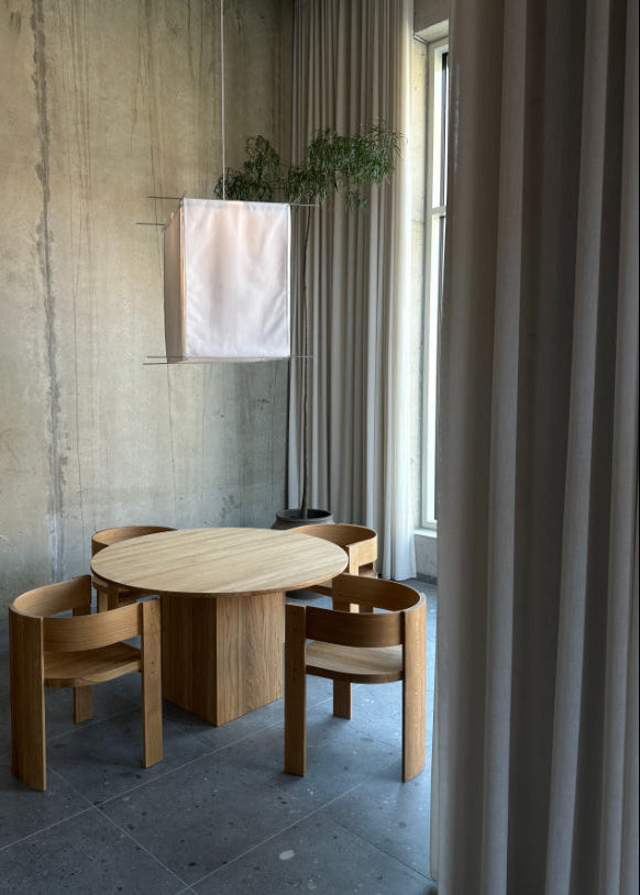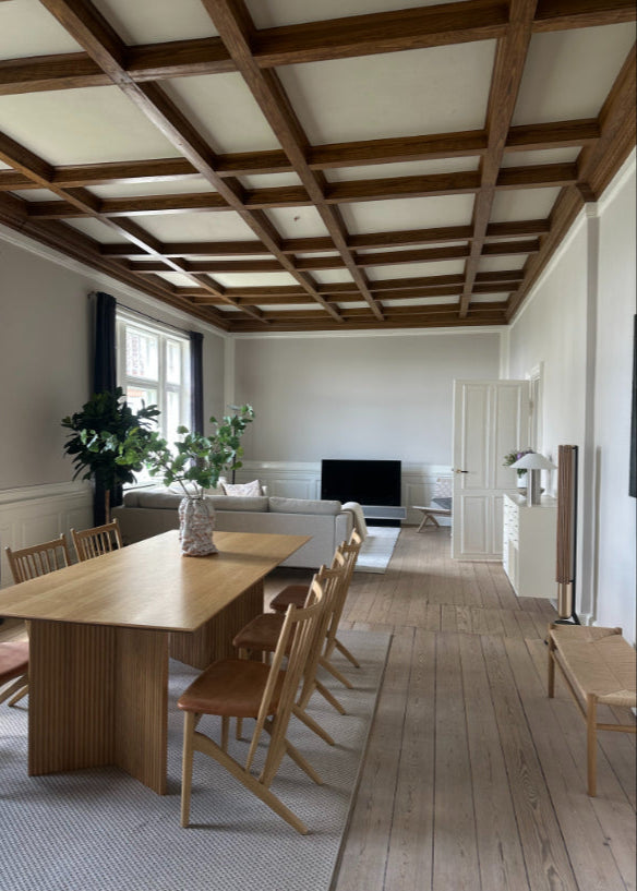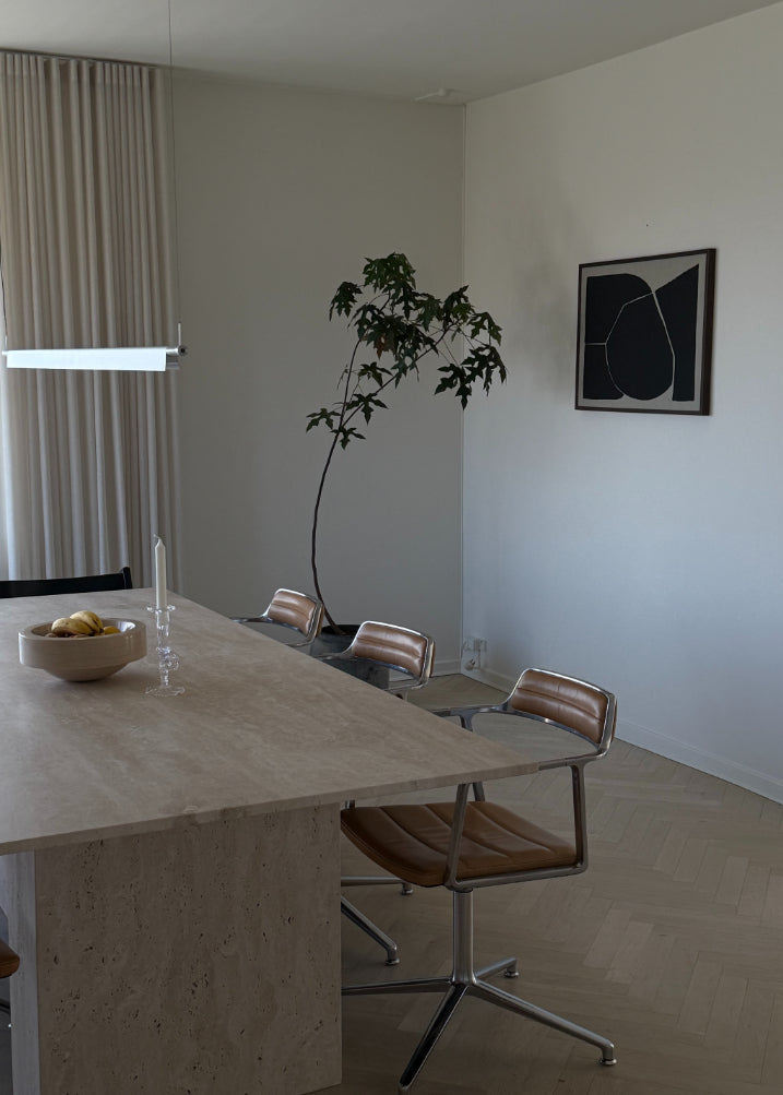 Privat indretning med fokus på at balancere kundens ønsker med æstetisk modspil. Gardiner og nøje udvalgte møbler er med til at definere boligens lyse og rolige atmosfære. Det specialdesignede spisebord er tegnet af route_ og produceret i samarbejde med WABI SABI.