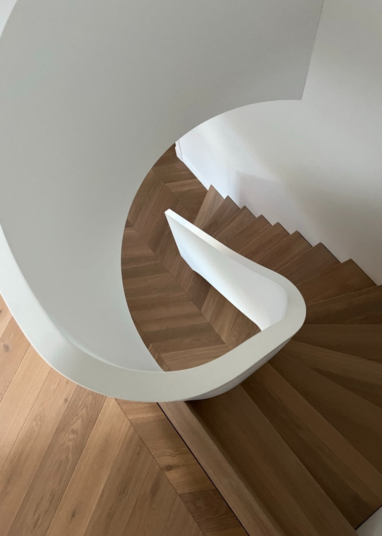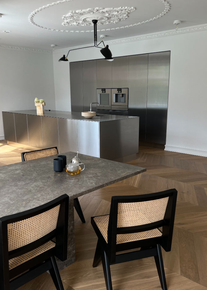 Total renovering af køkken og badeværelse med mange custommade elementer fra spisebord og vaskemøbler til køkkenet. Vi har designet og udført trappen som en integreret del af helheden. Stilretningen forener det herskabelige og klassiske med moderne design.